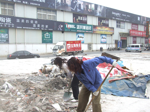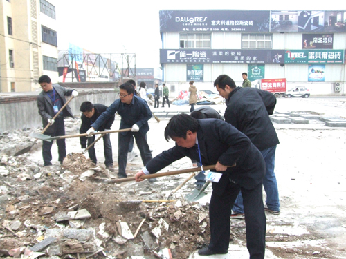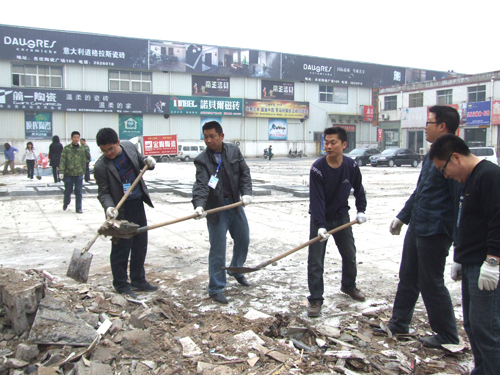 為了在五一到來(lái)前,把物資城打造成一個(gè)整潔、優(yōu)雅、舒適的經(jīng)營(yíng)場(chǎng)所,2010年4月20日上午,商管科科長(zhǎng)張靜超帶領(lǐng)物資城商管科全體員工,對(duì)市場(chǎng)內(nèi)原東大棚拆遷處垃圾進(jìn)行了集中清理。大家不畏辛苦,干勁十足,鐵锨、掃把此起彼伏。部分建筑垃圾由于堆放時(shí)間過(guò)長(zhǎng),工具不能清理干凈,市場(chǎng)工作人員就帶上手套,動(dòng)手清理……