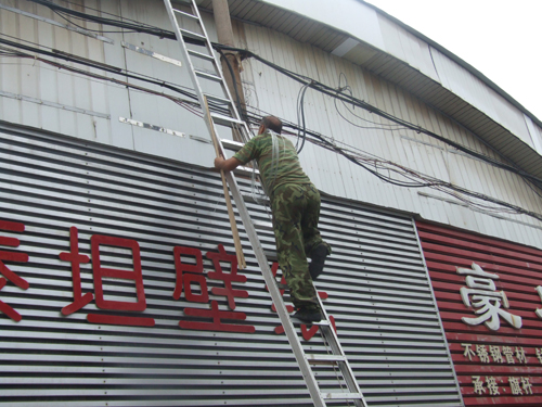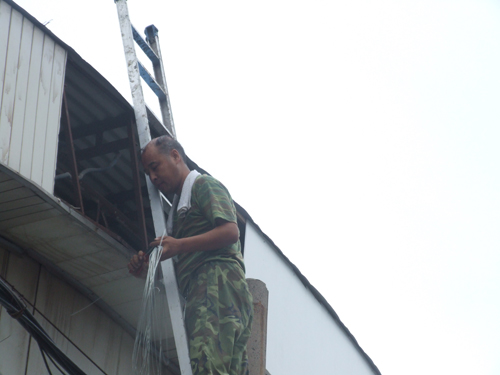 8月19日,大雨來(lái)臨之前,為保障物資城商戶(hù)的財(cái)產(chǎn)安全,后勤科頂著暴雨來(lái)臨之前的悶熱,將破損的大棚頂部及時(shí)維修完畢。
