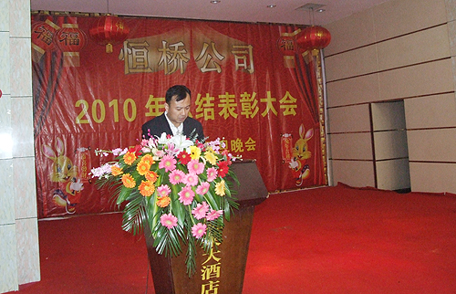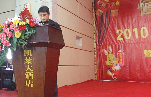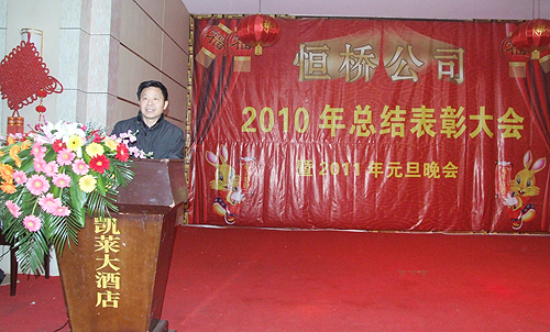 2010年12月29日下午,公司在凱萊酒店召開年終總結(jié)表彰大會,常務(wù)副總經(jīng)理李建軍對2010年經(jīng)營工作進行**總結(jié),董事長陳成順就公司未來發(fā)展和規(guī)劃做重要講話,副總經(jīng)理畢文輝宣讀了公司對王勇、盧艷等12名**員共的表彰決定,并為**員工分別頒發(fā)了證書和獎金。會議結(jié)束后,公司領(lǐng)導(dǎo)同廣大員工把酒言歡慶共賀新年。