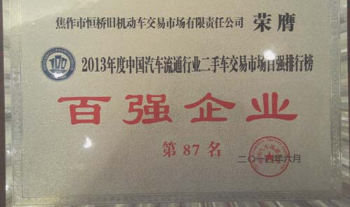 6月16日至6月18日,中國汽車流通協(xié)會在鄭州舉辦了“構(gòu)建二手車交易市場全新生態(tài)圈”主題論壇暨2013年度中國汽車流通行業(yè)二手車交易市場百強排行榜發(fā)布等系列活動。期間,中國汽車流通協(xié)會對2013年度中國汽車流通行業(yè)二手車交易市場百強企業(yè)進行了授牌儀式,焦作恒橋舊機動車交易市場有限責任公司榮膺2013年度中國汽車流通行業(yè)二手車交易市場百強企業(yè)。
